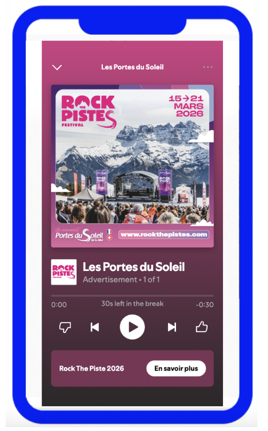 | Spot audio | 30 secondes | Bannière et logo requis au format 600x600px | MP3 | OUI | Exemple |